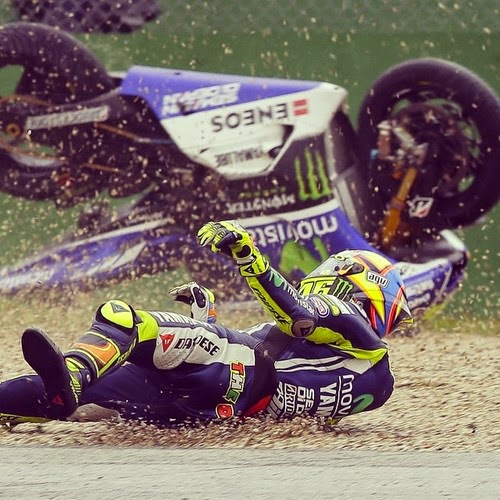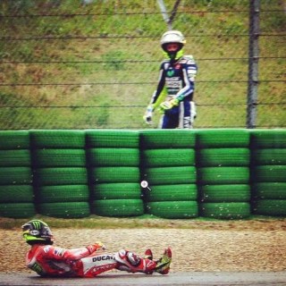 Mentre ci prepariamo psicologicamente ad una possibile ed epica bagarre tra Marc e Valentino l’inquadratura si sposta su Pedrosa che è caduto. Cosa si sarà sfracellato stavolta? Vuole battere il record di Evel Knievel? Ha scambiato i punti di sutura con quelli della Coop e pensa che più ne prende più regali sorprendenti riceverà?