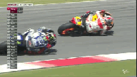 Lorenzo è ancora ultimo, Rossi ancora nono, Miller ancora primo e Marc da ultramillesimo sta cercando di tornare in una posizione decente, peccato che ci siano delle altre moto in pista, cosa che a lui non pare piacere molto tanto che si butta su Espargaro come un leone si avventa su una gazzella. Aleix rimane a galla per miracolo e Marquez continua a cercare di infrangere il muro del suono.