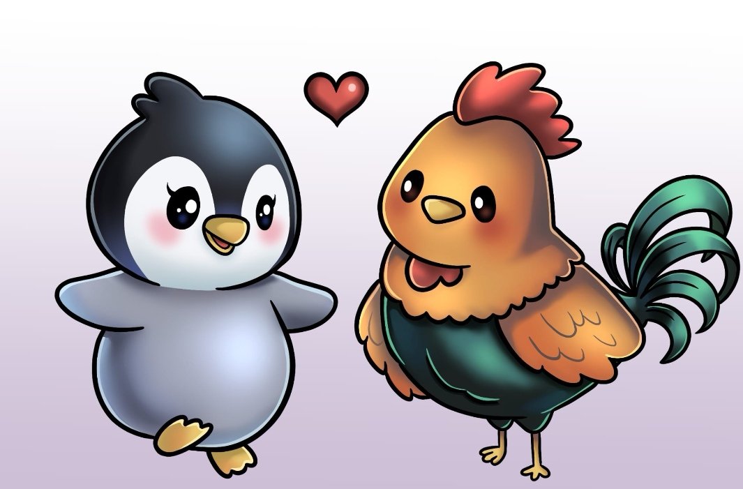 Per il compleanno di Mr Batterista ho fatto realizzare questa card: gli dico sempre che è un galletto mentre io mi sono sempre sentita un pinguino (ovvero goffa, imbranata, che inciampa, buffa in maniera piuttosto imbarazzante ma che a volte nel suo elemento naturale diventa agile e leggiadro).