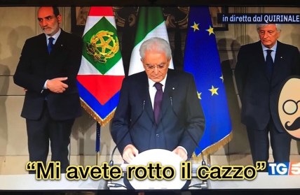 Dopo l’incontro delle due menti geniali –Mr Ruspini e Mr Dimaionese– il governo sembrava pronto ma poi, come un pokémon selvatico, è comparso Mattarella dall’erba alta e ha detto che il nome proposto come Ministro dell’Economia non andava bene per un cazzo e ha posto il veto; panico generale, Salvini e Di Maio impazziscono completamente, “Mattarella è un venduto, schiavo dei poteri forti e della Germiania, ALTO TRADIMENTOOOO!” e in maniera molto matura mandano a rotoli tutto quello che è stato fatto fino a quel momento.